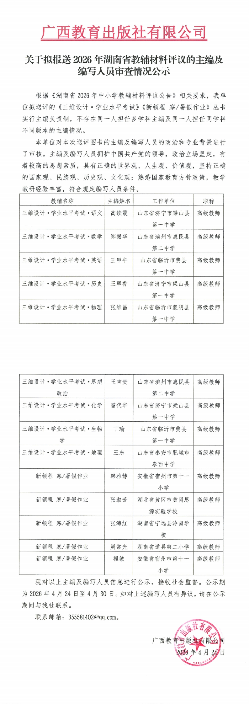 关于拟报送2026年湖南省教辅材料评议的主编及编写人员审查情况公示